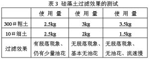 2.2 新配制的酒中,當酯類物質含量大于其溶解度時,多余的酯類會析出,飄浮在酒面上形成油花。原先采用的粗硅藻土是3000#,細硅藻土是300#,由于過濾密度不夠,再加上這種硅藻土易脫落,因此過濾機不能有效地將油花濾住。現在采用300#硅藻土為粗土,10#硅藻土為細土,這樣過濾密度增加的同時,硅藻土的粘度也得到增加。粘度附著力的增強,可防止硅藻土脫落,過濾效果得到加強,對油花就不會漏濾。(詳見表3)