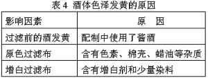 3 酒體色澤發黃的原因及解決辦法(見表4)