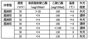由下表可以看出,失光與高級脂肪酸乙酯、乙酸乙酯等有著直接聯(lián)系。因此,需要根據(jù)不同類型的白酒及不同的酒度、調(diào)解酯的濃度,以達到產(chǎn)品需要的標準。
