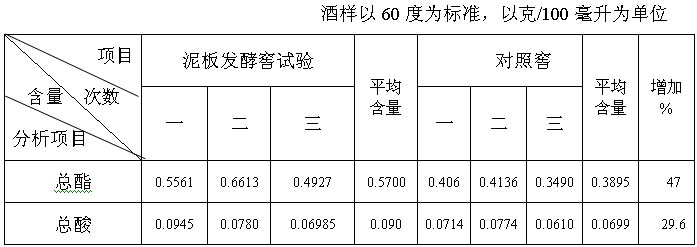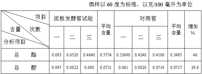 (1)濃香型白酒其主體香是己酸乙酯,來源于己酸菌產生己酸,在一些微生物酯化酶的共同作用下,使己酸和乙醇合成為己酸乙酯。根據梭狀芽孢桿菌是嫌氣性土壤細菌,喜歡在腐殖質較多的肥沃的粘土中生存。而老窖泥中生存著大量的梭狀芽孢桿菌,故濃香型白酒質量的好壞與發酵窖泥的優劣及酒醅接觸泥面積的大小有直接的關系。利用窖頂泥、肥沃土壤、榆樹葉、黃水、曲子等十二種原料(少許老窖泥作種子泥或加入培養的己酸菌液),加水攪拌均勻后入罈或窖充分發酵后,將此泥涂在百葉窗式的香泥板上,醅子入窖時分層放入窖內,擴大酒醅和窖泥的接觸面積,在發酵過程中,由己酸菌和微生物產生的酯化酶的共同作用下生成酯,通過蒸餾使成品的總酯含量有顯著增加。加香泥板窖與對照窖的成品化驗分析結果見表4。