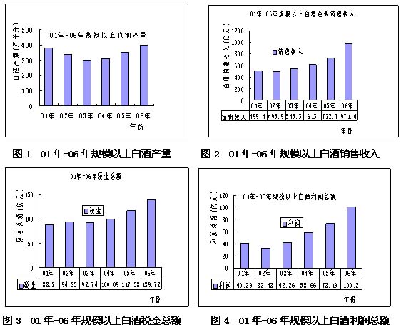 由圖1~圖4可知,從2001年到2006年白酒行業(yè)無(wú)論是從產(chǎn)量還是銷(xiāo)售收入、稅金總額和利潤(rùn)總額都是呈穩(wěn)步上升趨勢(shì),說(shuō)明白酒行業(yè)的產(chǎn)業(yè)經(jīng)濟(jì)正步入良性發(fā)展軌道。我國(guó)釀酒行業(yè)創(chuàng)造了良好的經(jīng)濟(jì)效益,為國(guó)家財(cái)政積累資金做出了重要貢獻(xiàn),而白酒在酒類(lèi)產(chǎn)品中所創(chuàng)造的效益一直名列前茅,每年為國(guó)家創(chuàng)造稅利上百億元,其中,低度白酒占據(jù)了舉足輕重的地位。當(dāng)前,我國(guó)白酒行業(yè)的生產(chǎn)呈現(xiàn)出規(guī)?;?、工業(yè)化、多元化格局,低度白酒產(chǎn)業(yè)逐步走向規(guī)模經(jīng)濟(jì)效益型,并帶動(dòng)了相關(guān)產(chǎn)業(yè)的發(fā)展。