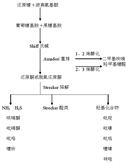 美拉德反應是氨基化合物和還原糖化合物之間發生的反應,是產生一系列香味物質的重要反應。該反應集縮合、分解、脫羧、脫氨等一系列交叉反應。產生多種酮、醛、醇及呋喃、吡嗪、吡喃、吡啶、噻唑、吡咯、噻吩等雜環類化合物,這些香味物質是構成芝麻香的重要組分。其反應過程見下圖。