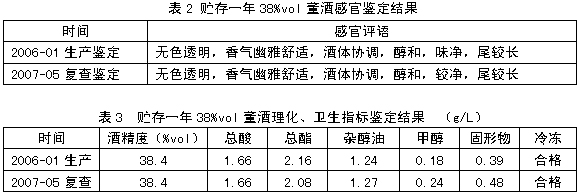 3.2.1貯存一年同一批次的38%vol董酒進行感官指標、理化、衛生指標鑒定,生產出廠時的感官指標、理化、衛生指標與現在復查結果對比見表2、表3。