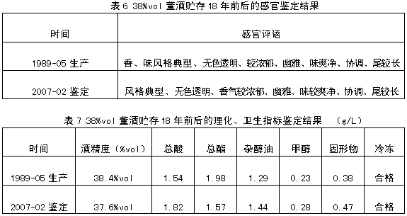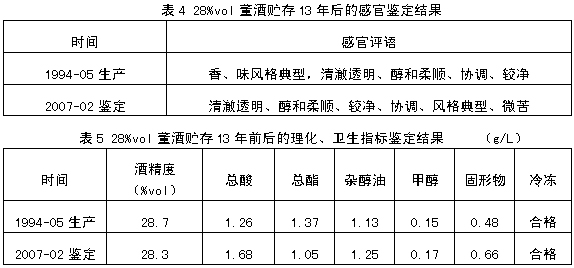 4.2.3 從28%vol、38%vol董酒多年變化的理化、衛生指標鑒定情況看,總酸、雜醇油、甲醇、固形物比原來有所增加,酒精度、總酯比原來有所下降。28%vol酒經過13年的貯存,38%vol酒經過18年的貯存后,其理化、衛生指標值都在標準范圍以內,符合標準要求。