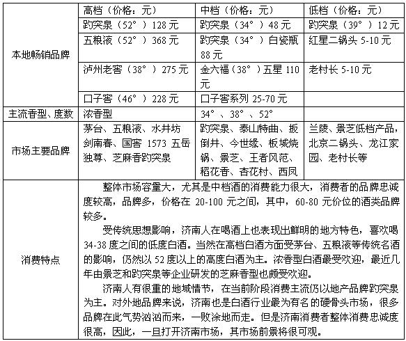 在魯酒復興的大前提下,濟南作為省會城市的戰(zhàn)略性地位日益重要。受主流魯酒企業(yè)紛紛搶灘濟南市場,魯酒板塊整體產(chǎn)品價格提升和品牌策略的調(diào)整及其消費多元化趨勢的影響,濟南白酒市場正在經(jīng)歷著由量的增長向質(zhì)的提高的深度調(diào)整期。