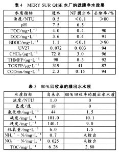 濃度的鹽類有較高的截留效果,但該種納濾膜對進(jìn)水要求幾乎不含濁度,一般要求進(jìn)水的SDI<3,位于法國巴黎郊外的MERY SUR QISE水廠,其工藝流程為沉淀、臭氧、雙層濾池、微孔過濾和納濾。其凈水效果如表4。國內(nèi)有人,在實(shí)驗(yàn)室中用納膜(TRISEP公司生產(chǎn)的2514卷式TS80NF)制備飲用水,能有效去除水中的NH+
