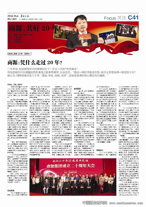 2014年10月18日,浙江商源集團在杭州隆重舉行“商源集團成立20周年”慶典,知名業界專家、行業協會負責人、名酒企業負責人齊聚一堂,共慶商源20周年。起步于小商家的商源,如今已經是擁有員工5000余名、超過100家的久加久連鎖及中商投資集團的大航母。根據商源的規劃,期望未來銷售規模達到100億元目標。