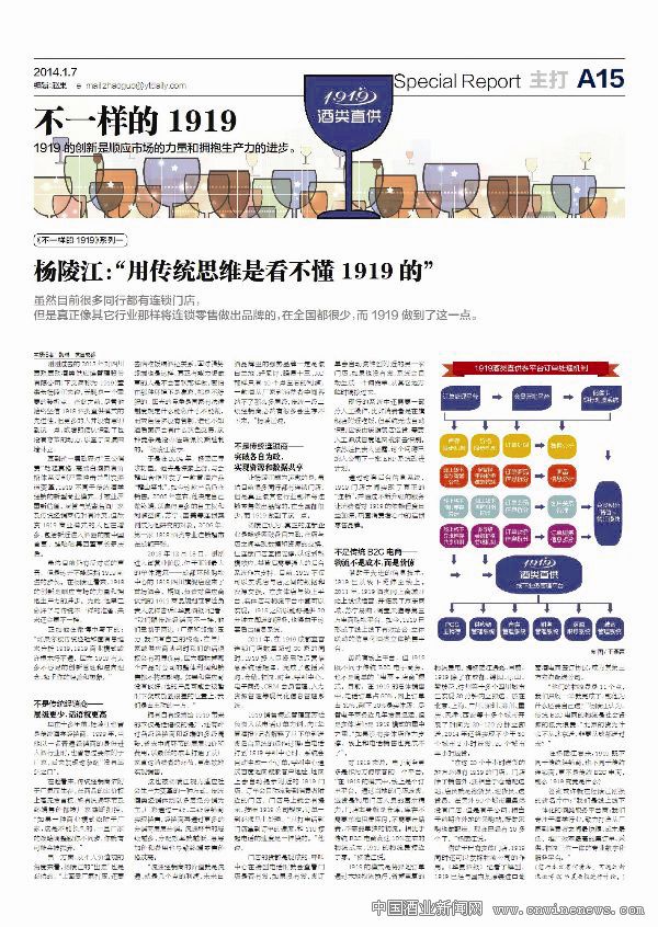 2011年,楊陵江投入巨資啟動1919運營信息系統化矩陣,完成了包括采購、倉儲、物流、呼叫中心、電子商務、CRM會員管理等現代化信息管理系統。同時,1919酒類網上商城上線試運營,而其在成都的直營連鎖門店數量也迅速激增,從2006年1919建立第一家連鎖超市算起,當年的銷售收入為300萬元,到2012年,壹玖壹玖銷售額為3億元,6年間增長100倍。根據規劃,1919將在2014年覆蓋全國31個省級行政區,全國銷售網點達1800個。