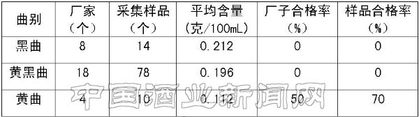 (3)采用黃黑曲生產廠家,甲醇平均含量為0.196克/100mL,全部樣品超標,無一家廠子合格。