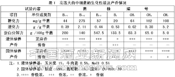 高溫嗜熱芽孢桿菌,在制曲過程中自始至終存在并占絕對優勢,要保證高溫細菌的生長繁殖,高溫多水的條件必不可少。我們以醬香高溫大曲為含菌樣品,分離到若干株細菌,其生化性能及產香結果見表1。