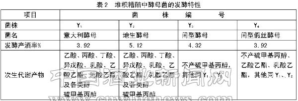 我們從醬香堆積糟醅中分離到若干株酵母菌,經分類鑒定,它們分別歸屬于意大利酵母、地生酵母、釀酒酵母、間型假絲酵母等。這些酵母菌不僅具有較高的發酵力,還同時代謝產生高級醇、有機酸及酯類物質,尤其是意大利酵母、地生酵母,可將蛋氨酸轉化為硫甲基丙醇、硫甲基丙醛等芝麻香味物質(表2)。