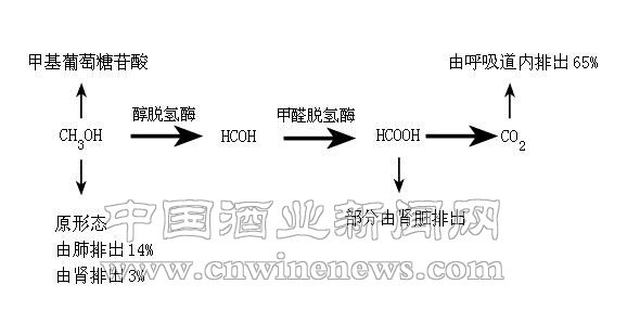 甲醇的氧化分解很慢,在人體內可經呼吸道、胃腸道吸收,在皮膚內亦可有一部分被吸收。當甲醇被人體吸收后,因甲醇在水和液體中的溶解速度極快,因此,在腦脊液、血、膽汁和尿中的甲醇含量最高,骨髓及脂肪內含量低。此外,由于甲醇氧化分解慢,從體內排出也慢,因此,在人體內毒性也最強。未被消化的甲醇可經呼吸道及腎臟排出體外,而另一部分則經胃腸道緩慢排出(下圖)。