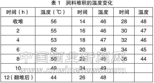 將粉碎過的高粱、小麥、大麥、豌豆摻拌均勻,加入95℃以上的高溫水,水量為原料量的70%;快速摻拌后攏成錐形堆進行高溫堆積,堆積時間36小時,中間第12小時翻堆一次。控制好收堆和堆積溫度。大米在糊化前1小時加入30%的45℃左右的溫水浸潤。混合潤料后的要求是:手搓成面,有生料香、無異味。
