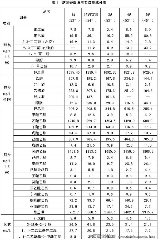 根據(jù)領軍企業(yè)認定會上提供的芝麻香白酒樣品,我們對5家企業(yè)(景芝、趵突泉、扳倒井、泰山生力源、水滸)的產品進行了感官品評和微量成分檢測(見表1),發(fā)現(xiàn)5種產品各具特色:有的清正典雅、芝麻香典型;有的窖香幽雅、芝麻香細膩;有的香味馥郁、芝麻香幽雅。