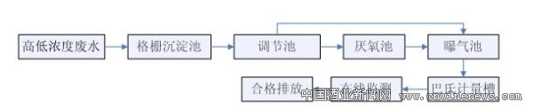 釀酒廢水如黃水、沖洗水、底鍋水等是高濃度有機廢水,COD值2.5萬mg/L—5萬mg/L,懸浮物含量100mg/L—250mg/L。2009年稻花香酒業投資100多萬元建成了釀造廢棄物治理及綜合利用工程,日處理能力為150m³-200m³。此工程包括:收集池、好氧工藝處理污水、發酵產沼氣,生產用10噸鍋爐燃氣改造。濾液經好氧處理后污染物穩定就可達標排放。可大量減少COD排放量,大大促進了廢物減量化、資源化和無害化。其經厭氧發酵產生的沼氣經氣水分離及脫S處理后送儲氣罐,通過管道則可用于鍋爐燃料。這樣既節約資源,又減少污染,釀酒廢水每日排放量 70m³-80m³,可日產沼氣400m³-450m³。每立方米沼氣的熱值相當于1公斤標煤,每年可節約燃煤200多噸。工藝流程見圖4。