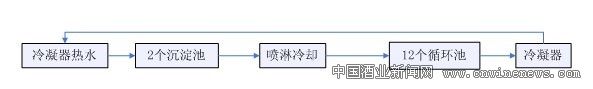 利用固態發酵法生產白酒的過程中,潤料、加漿、冷卻等都需要耗用大量的水,除了少量的水用于投料潤糧、潑漿外,其余大部分的水用作冷卻水,冷凝器中冷卻水直接排放,對環境造成熱污染,同時浪費了水資源。針對冷卻水僅對水溫有較高要求,而對水質要求不高的特點,為了避免水資源的浪費和環境污染,稻花香酒業與科研單位聯合設計并安裝了冷卻水循環自動化控制裝置,將車間除5個冷凝器之外的蒸酒用水經過冷卻處理,即可重復進行循環利用。增設了14個循環水池、噴淋管、水泵,自動控制柜、工程師站等整套循環水設備。通過運行使基酒生產噸酒耗水量由原來的53噸降到38噸,與此同時還大大降低了污水的排放量。其工藝流程見圖1。