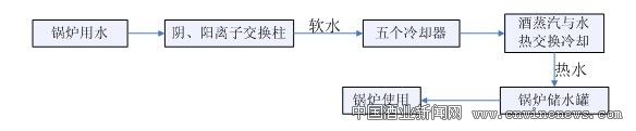 其工藝為:將鍋爐用水通過陰、陽離子交換柱輸送到釀造車間的5個冷凝器,對酒蒸汽進行冷卻,冷卻過程中進行熱交換,鍋爐儲水罐將生產班組的冷卻水收集起來提高到60℃—80℃,提供給鍋爐使用,提高鍋爐進水溫度。流程見圖2。