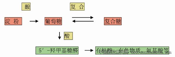 雜醇油是C原子數大于2的脂肪族醇類的統稱,主要由正丙醇、異丁醇、異戊醇和活性戊醇等組成,它是構成酒類風味的重要組成物質之一,但其過量會影響酒體質量。在生產中,當黃水出現發(fā)黑和無懸現象,則酒體中的雜醇油一般會偏高,特別是入窖酸度偏高和產率影響較大的糟醅,雜醇油更高,酒體中的醛類和乙酸等也會增加。當入窖糟醅酸度較高和窖內升溫困難時,淀粉的酸和酶雙解糖化加快,糟醅中的糖度增加,糖份又不能被及時和充分轉化,出窖糟醅的殘?zhí)瞧撸诮褍仍沲校岬脑黾哟龠M糖類酸解轉化成有機酸和色素等如:圖2,有機酸脫羧等反應生成雜醇油;酸的增加促進蛋白質的分解,生成氨基酸,氨基酸脫氨生成雜醇油;雜醇油還可由酵母代謝生成,在發(fā)黑和無懸黃水中,酸度高,蛋白質含量不高;有懸黃水中,蛋白質含量高。