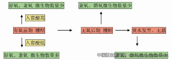 在圖2中,隨著酸度的增加,將加快有機酸和色素生成,加大抑制糟醅中酵母菌的生長、繁殖和代謝,降低出窖糟醅的產率,糟醅顏色深黯,出窖黃水顏色變黑。在窖內糟醅發(fā)酵的中、后期,糟醅中的酸、阻礙物和氧的耗用(探討),又抑制了窖內的兼氧和嫌氧類微生物的生長、繁殖和代謝,出窖黃水就清淡、無懸。