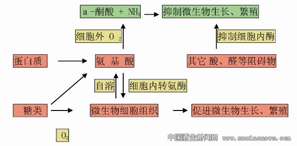 入窖糟醅酸度低、升溫猛和頂溫高的窖黃水發(fā)黑和無懸的成因難以理解。是什么因素導致發(fā)酵后期窖內糟醅中兼氧、嫌氧微生物難以生長、繁殖和代謝?在這里不能用糟醅中的酸和阻礙物來圓滿解釋,這種情況的出現,入窖糟醅或較瘦,或糠大水輕,或蒸糧未熟,或踩窖過松,或發(fā)酵期長等,它們都是與糟醅中可用淀粉較低和窖內含氧過多關系緊密,在糟醅發(fā)酵中、后期,糟醅中兼氧和嫌氧類微生物所必須的營養(yǎng)物質(如:葡萄糖等)較少和氧的耗用,使糟醅中的兼氧、嫌氧類微生物難以生長、繁殖和代謝或自溶(如:壓排窖),導致出窖黃水發(fā)黑和無懸。