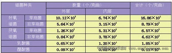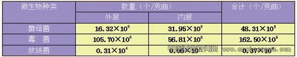 從專用大曲的外層到內層,霉菌的總數為162.50×106cfu/克·干曲,占微生物總數的70.10%;酵母菌的總數48.31×106cfu/克·干曲,占微生物總數的20.81%;細菌的總數為20.58×106cfu/克·干曲,占微生物總數的8.93%(其中好氧菌15.75×106cfu/克·干曲,厭氧菌4.82×106cfu/克·干曲);放線菌僅為0.37×106cfu/克·干曲,占微生物總數的0.15%。