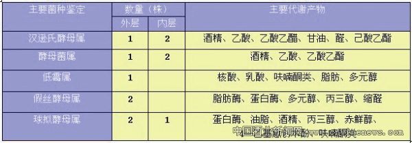 表2:徐坊芝麻香專用大曲外層和內層的主要酵母菌分布
