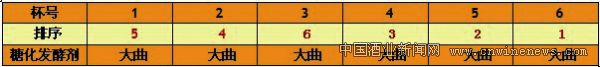 答案(見表8) 。總分:36分。排序18分;重現4=5,6分;典型:芝麻香,6分;糖化發酵劑:大曲,6分。