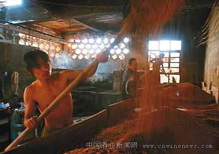 原料→浸泡→初蒸→燜水→煮糧→吊甑→復蒸→出甑→降溫→下曲→入箱→出箱→發酵→蒸餾