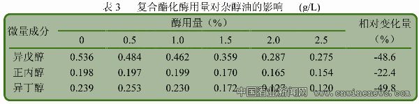 在白酒發酵過程中,雜醇類物質的生成途徑主要有兩個:一是酵母以糖為基質的合成代謝路徑,常發生在發酵材料中氨基酸氮過低時,酵母不得不通過糖代謝,走酮酸路線去合成必需的氨基酸,進而合成自身細胞蛋白,其中間體酮酸在酶的作用下脫羧、還原可以生成雜醇;二是酵母以氨基酸為基質的降解代謝路徑,常發生在發酵物料中氨基氮充足時,過多的氨基酸在酵母酶系的作用下,脫氨基、脫羧基生成比氨基酸少一個碳原子的雜醇。表3為復合酯化酶用量對雜醇油的影響結果。