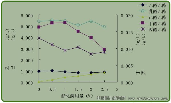 白酒在釀造發酵過程中,有機酸與乙醇經生物化學作用而生成的乙酯,謂之乙酯化。 從微生物而論, 酵母菌、 霉菌和細菌都有酯化能力, 綜觀人們對四大乙酯的認識、 實驗與應用主要在霉菌與酵母菌上。運用復合酯化酶來提高基酒中的各種酯類的含量在白酒生產的應用越來越受到重視。圖1為酯化酶對酯類物質生成的影響。