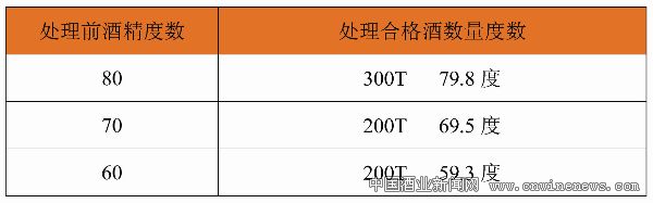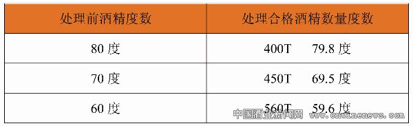 實驗二:先將80度酒精通過同樣顆?;钚蕴窟M行吸附,到經品評化驗員化驗其質量與剛開始吸附時質量稍有差別時,即改用70度酒精進行吸附處理,按同樣方法到吸附60度酒精至活性炭完全飽和,吸附質量經品評化驗剛好合格為止,其實驗結果(見表2)。