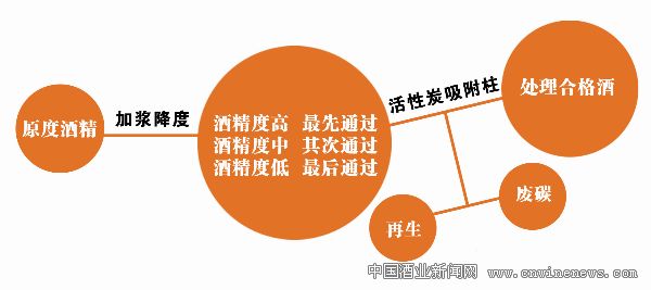 它以顆?;钚蕴繛槲浇橘|面,可根據需要將酒精降度,從高度到低度(最低度根據勾兌需要確定)幾個不同酒精檔次(一般相差10℃左右);然后,先用最高度酒精進入活性炭吸附柱,進行吸附處理,直至吸附酒精質量不達標準(由品評和化驗來確定)為止,在用同樣方法逐次將不同檔次(酒精由高到低)酒精通過活性炭進行吸附。