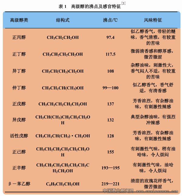 包括醬香型白酒在內的各種香型的白酒都含有一定量的高級醇類,高級醇類是白酒中重要的風味物質,適量的高級醇類能賦予白酒濃郁、芬芳、醇甜等特殊感官特征。在白酒當中,高級醇類對酒體的特殊香氣和口感的貢獻度是比較高的。高級醇類的主要風味特征見表1。