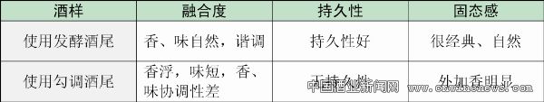 進一步可作小樣對比試驗:在同樣的酒基條件下,設定融合度、持久性及固態感3項對比指標(見下圖)