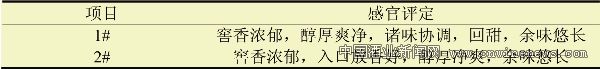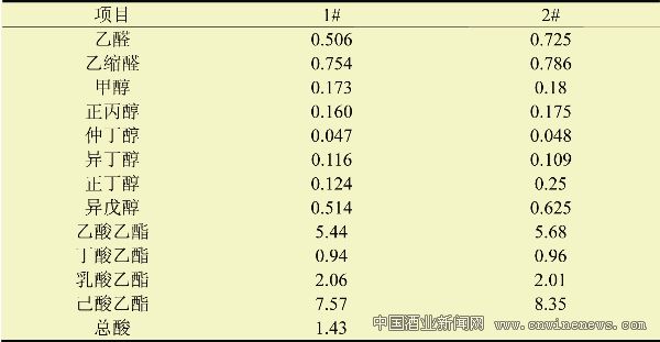 3.1.2 雙輪底糟配醅蒸酒1#和雙輪底糟直接蒸酒2#后原酒色譜分析情況見(jiàn)表3,感官比較情況見(jiàn)表4。