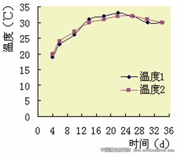3.1.3 雙輪底糟配醅后入窖發(fā)酵升溫情況見(jiàn)圖1。