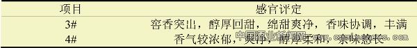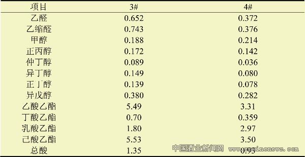3.1.4 上排雙輪底糟配醅,經(jīng)一輪次發(fā)酵后,蒸餾取酒3#與按正常工藝配醅的大米查酒4#酒,理化分析見(jiàn)表5,感官品評(píng)見(jiàn)表6。