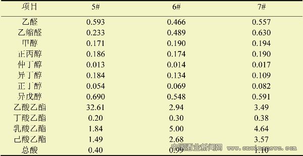 由表7中可以看出,6#、7#酒樣的總酯、總酸均比5#有明顯提高,且蓋面雙輪底糟的厚度越高總酯、總酸的含量就越多。
