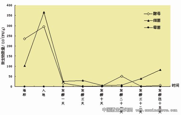 霉菌總數在整個過程中明顯偏少,僅在堆積前期撒入曲粉的短時間內存在,隨著酒醅溫度的上升與發酵時間的延長數量急劇下降,直至完全消失。