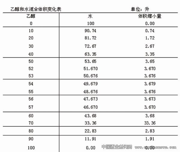 不同比例的乙醇和水混合成100升乙醇溶液,所需的乙醇和水的升數及縮小量(見表1)。當53.94升的乙醇和46.83升的水混合時,達到體積縮小的最大值為3.779升,這時酒度為53度—55度左右。締合度越大,酒精分子的自由度越小,酒的柔和度增強。