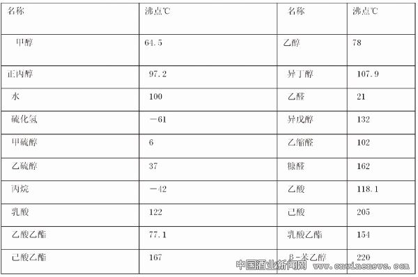 剛蒸餾出來的白酒,含有較多的低沸點成分,如硫化氫、硫醇、硫迷、丙烯醛、游離氨等,使白酒帶有強烈的新酒臭和刺激感,但由于乙醇分子之間文章來源華夏酒報或與水分子之間的氫鍵作用,使沸點比和它分子量相近的烷烴類要高的多。例如:乙醇(分子量是46)的沸點為78.3℃,而丙烷(分子量為44)的沸點為—42℃,在自然老熟貯存過程中,低沸點物質分子不斷擴散和揮發,從而使白酒的新酒臭味和刺激性減弱,且隨著溫度的升高,揮發作用加快,一段時間后,使酒體變得成熟、柔和(見表3)。