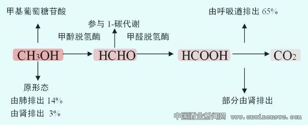 由于甲醇氧化分解慢,從體內(nèi)排出也慢,因此在人體內(nèi)毒性作用也較強(qiáng)。未被氧化的甲醇可經(jīng)呼吸道及腎排出體外,另一部分也可經(jīng)胃腸道緩慢排出。甲醇代謝途徑如圖所示。