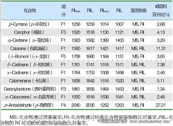 萜烯類化合物的定性通過與NIST 05質(zhì)譜庫(Agilent Technologies Inc.)中標(biāo)準(zhǔn)譜圖比對,以及標(biāo)準(zhǔn)品的保留指數(shù)(RI)定性;沒有標(biāo)準(zhǔn)品的,采用文獻(xiàn)報道的RIL定性;否則為臨時性鑒定。