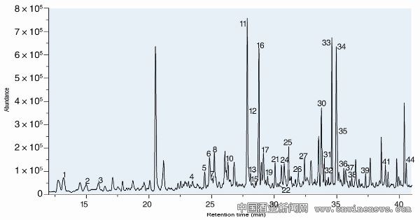 &nbs文章來源華夏酒報p; 質(zhì)譜條件:EI電離源;電子能量:70eV;離子源溫度:230 ℃;掃描范圍:35 amu-350 amu。