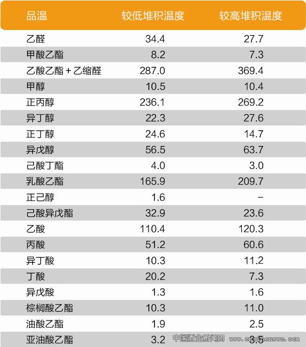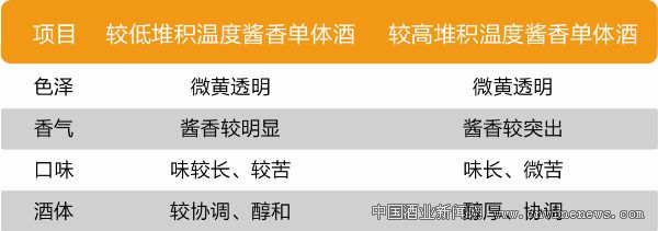 由國家白酒評委、山東省白酒評委和公司評酒委員對兩種堆積溫度條件下的半成品酒進行了品嘗對比,結果見表3。