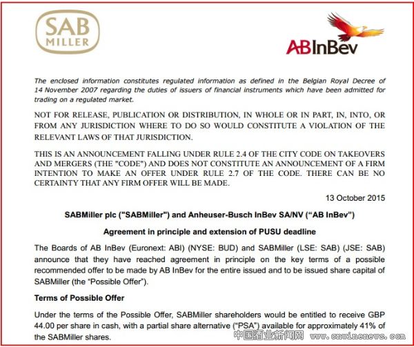 就在昨天,百威英博在其官網第四次對SABMiller提出收購要約。新的現金收購價是每股43.5英鎊。對于近41%選擇股票和現金收購價的SABMiller股票持有者,新的收購方案是,可以持有0.483969的百威英博限制性股權及每股現金3.5英鎊。據百威英博官網顯示,這次收購提出的每股現金43.50英鎊比2015年9月14日SABMiller的股票收盤價29.34英鎊高出48%。