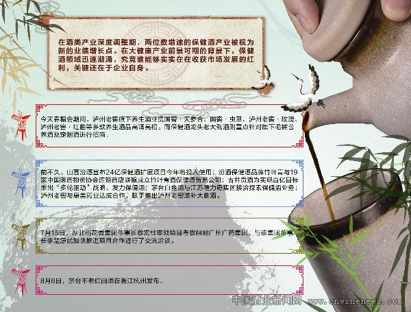 前不久,山西汾酒宣布24億保健酒擴展項目今年將投入使用;汾酒保健酒品牌竹葉青與19家中國醫藥物資協會連鎖藥店聯盟成立竹葉青酒保健酒貿易公司;古井貢酒為實現百億目標推出“多輪驅動”戰略,發力保健酒;茅臺白金酒與江蘇隆力奇集團接洽探索保健酒業務;瀘州老窖與康美藥業達成合作,聯手推出瀘州老窖滋補大曲酒。
