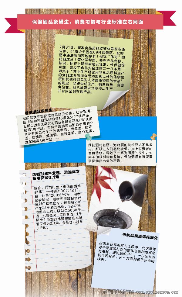 國家食品藥品監(jiān)管總局的一則通告,將諸多保健酒企業(yè)涉嫌非法添加化學物質(zhì)的行為曝光天下,知名企業(yè)也涉嫌其中,保健酒行業(yè)的隱秘面紗似乎被揭破。諸多人士認為,這個案例對于保健酒行業(yè)的負面影響力并不亞于當年酒鬼酒遭逢的“塑化劑事件”。
