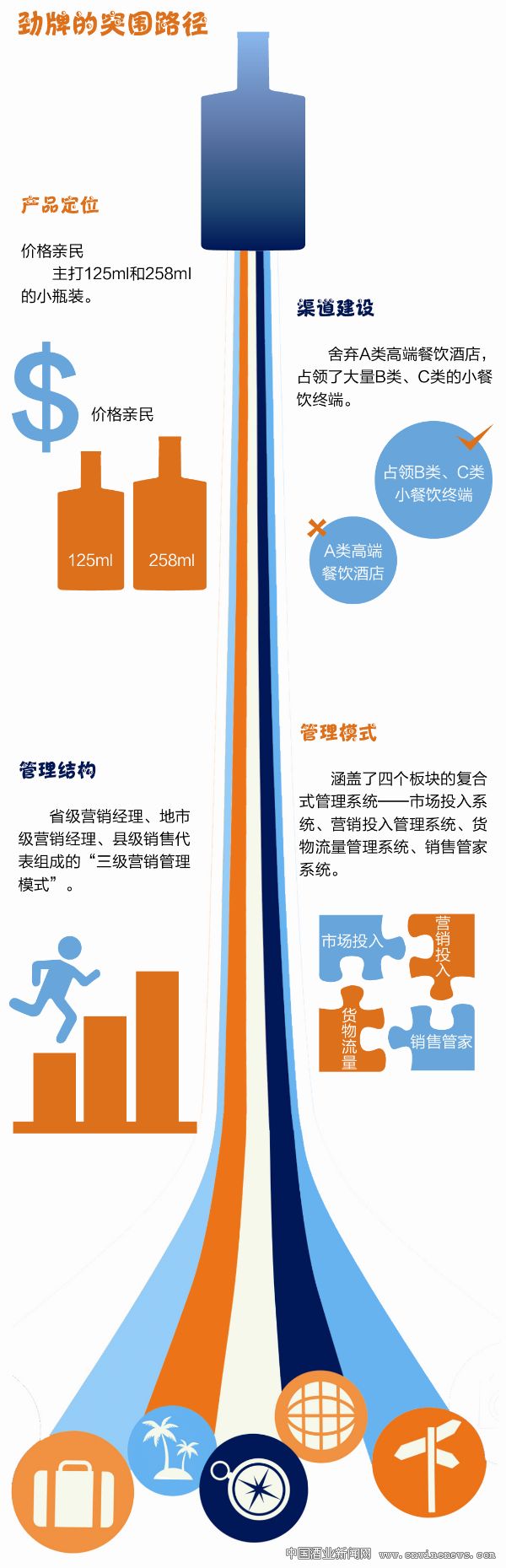 在管理結(jié)構(gòu)上,勁牌采用省級營銷經(jīng)理、地市級營銷經(jīng)理、縣級銷售代表組成的“三級營銷管理模式”,以此為框架,組建了多達8000人的營銷隊伍,強力支援經(jīng)銷商的市場營銷工作。
