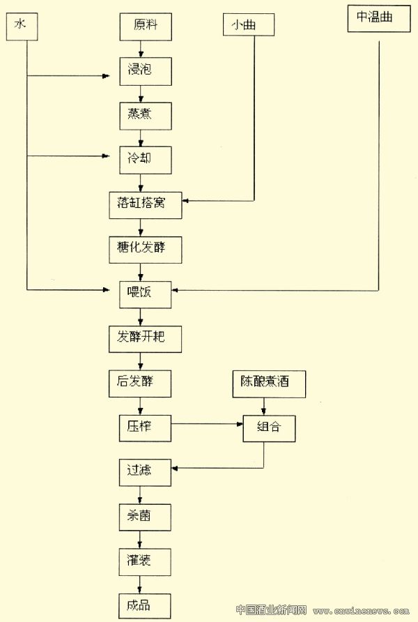 該工藝采用小曲、中溫曲做糖化發酵劑,生產的黃酒,口感較淡薄、余香較短。